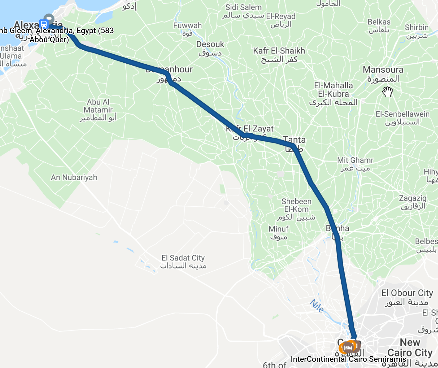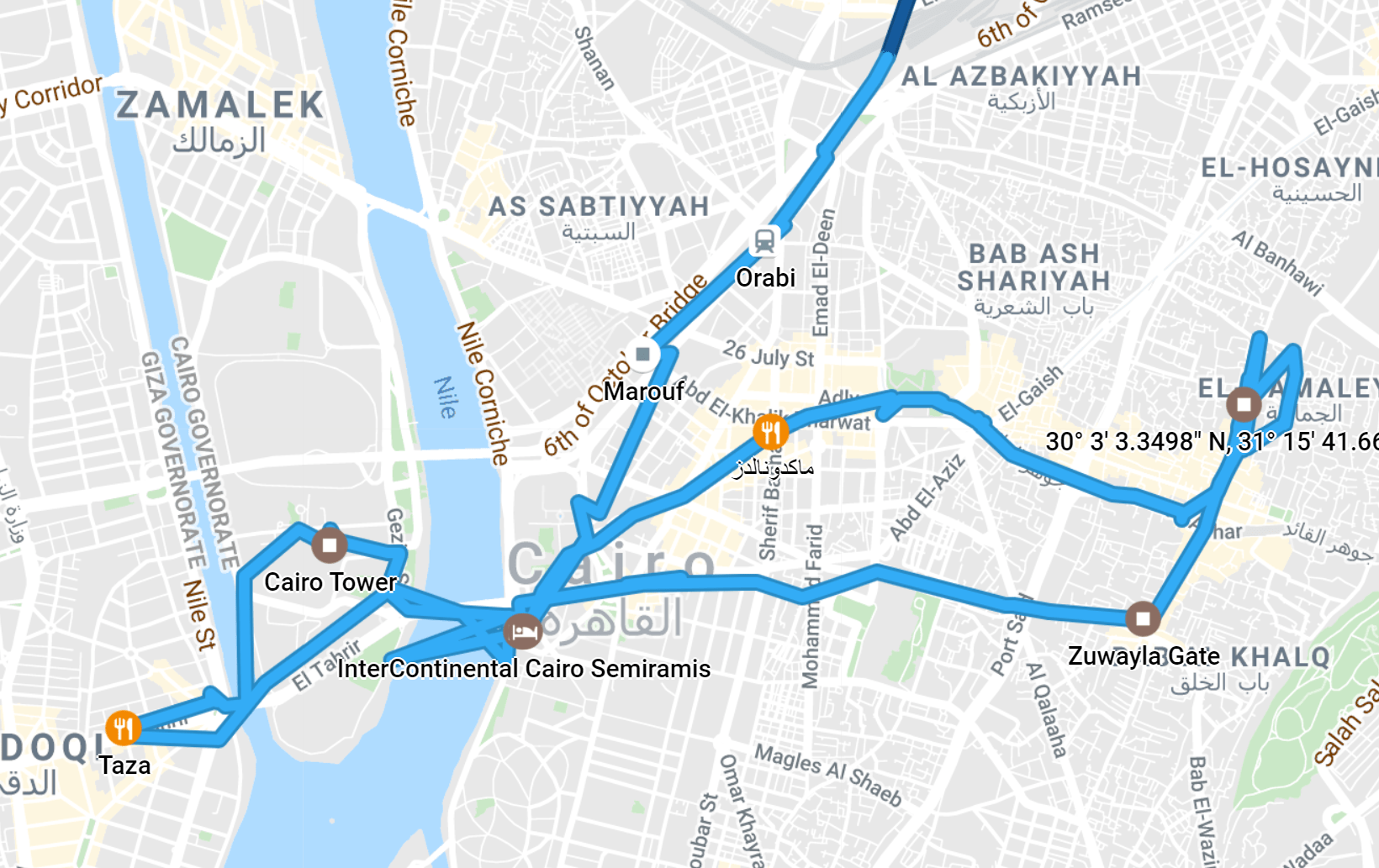 Last night we learned that we would not be able to get a COVID test after 5 PM. As a result, we abandoned any attempt to visit the Alexandria Library (something I am quite disappointed about) and instead took a tram to the train station in time to catch a 7:20 AM train to Cairo. In Cairo, we then dropped off our luggage at the hotel and verified we were scheduled for the COVID PCR test. The appointment was for a medical person to come to the hotel. In the meantime, however, we took a walk on the Westside of Cairo and visited the bottom of Cairo Tower. We decided the £200 EGP/person (~$13 USD) was not worth spending and instead took some pictures from the bottom (we were expressly given permission to do so), before grabbing some lunch and heading back to the hotel.